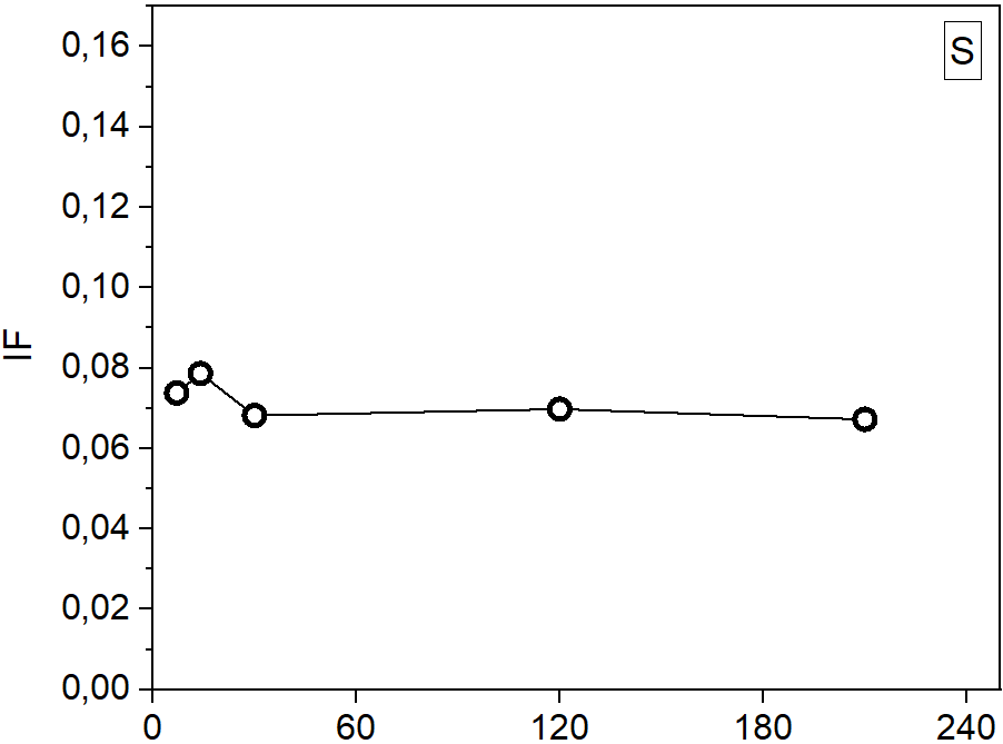 An extremely important factor in the stability of a reference sample, especially an organic one, is the storage mode, which will not allow changes in the organic matrix and, accordingly, in the intensity of the X-ray fluorescence signal. If a sample is stabilized using a certain sample preparation procedure, long-term storage is possible. In this study, stability was proven by measuring for 210 d on days 7, 14, 30, 120, and 210. According to the test results, the sample showed a high level of stability. The largest change in element content did not exceed 15% (fig. 7–13). The world QA/QC practice in elemental microanalysis involves the use of a reference sample from the IAEA, or the National Institute of Standards and Technology, USA. A high-quality sample preparation system for a reference sample, especially for samples with a complex organic matrix, can significantly decrease the error, reducing it down to the hardware level [24–29].