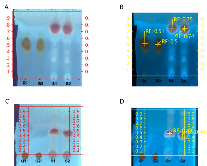 Fig. 1: Thin layer chromatography (TLC) test results on 96% ethanol extract of S. lappa. GF254 silica gel stationary phase, the mobile phase (A) CHCl3:MeOH; (B) N-hexana: etyl acetate, and quercetine as control. (A) and (C) observed under UV 254 nm; (B) and (D) observed under UV 366 nm. Q1-Q2 = quercetin, S1-S2 = S. lappa ethanol extract