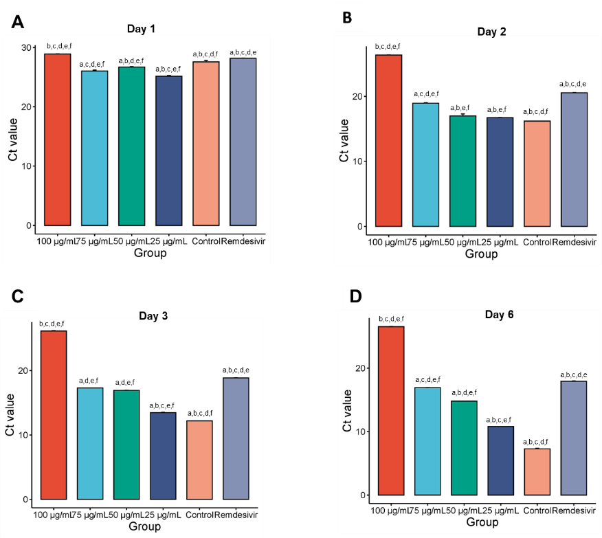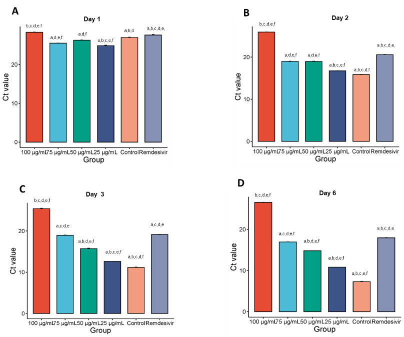Fig. 8: The dose correlation of the extract with the resulting Ct value on observation days 1, 2, 3, and 6
