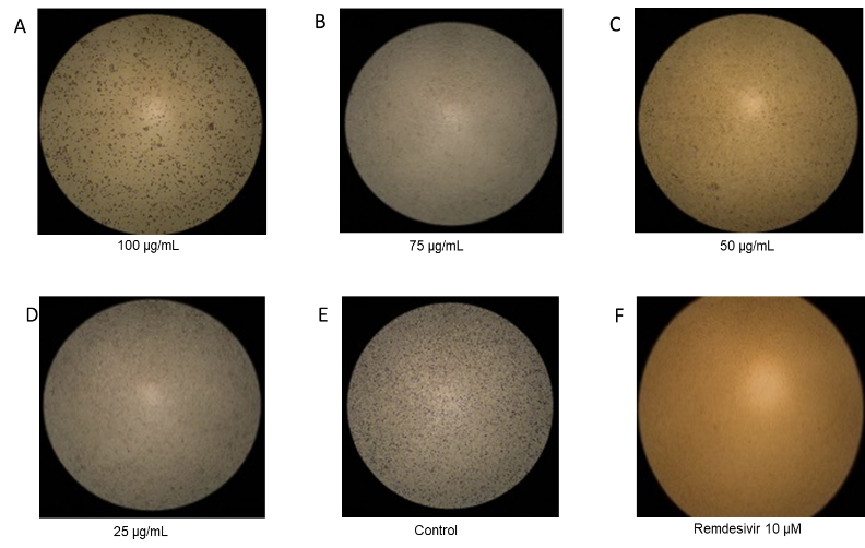 Testing was done by seeding the Vero cells on the 6-well plate. Extracts with 25; 50; 75; and 100 μg/ml concentration are prepared in ependorf, with Remdesivir 10 µM as a positive control, respectively. Then, each extract concentration was added to the virus isolate, as much as 200 TCID50. Remove the medium from the 6-well plate, then add a mixture of extract and virus, shaking the plate so that the virus and extract are even. Then put 6-well plates in a CO2 incubator at of 37 °C. Observations were performed on days 1, 2, 3, and 6 with a reverse microscope to see the percentage of cells experiencing cytopathic effects. The supernatant from each treatment is collected on days 1, 2, 3, and 6 and subsequently subjected to quantitative testing. Extracting RNA by Reverse Transcription Polymerase Chain Reaction (qRT-PCR) involves using the QIAmp Viral RNA Mini Kit (manufactured by Qiagen, Germany). The detection of viral genomic material is then carried out using the One Step TaqMan real-time RT-PCR kit (manufactured by Thunderbird, Toyobo, Japan) [18].