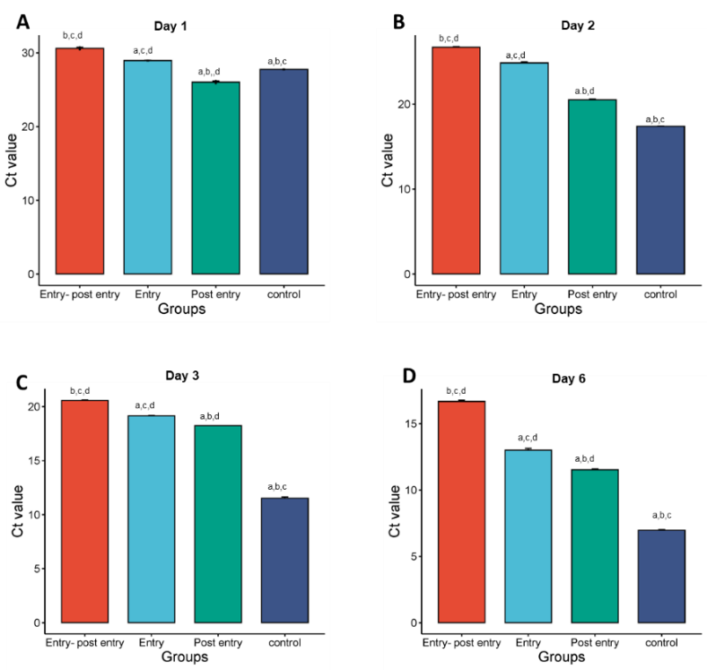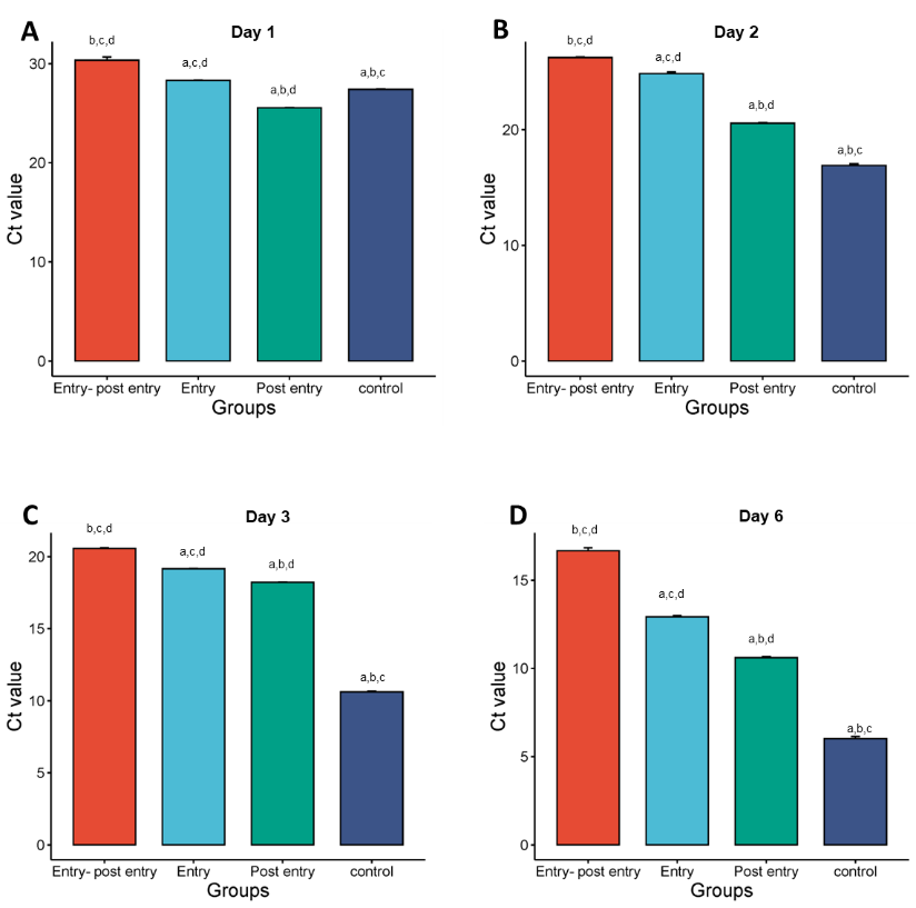 The results of the time addition experiment, as shown in fig. 5, show a difference between the result of the Ct value on each day of observation and the stage of the working mechanism of the test material. On the observation of the first day, there are significant differences between the results of Ct values in each treatment group (p<0.05), where the entry-post entry mechanism obtains the highest value. The same results were found on days 2, 3, and 6.