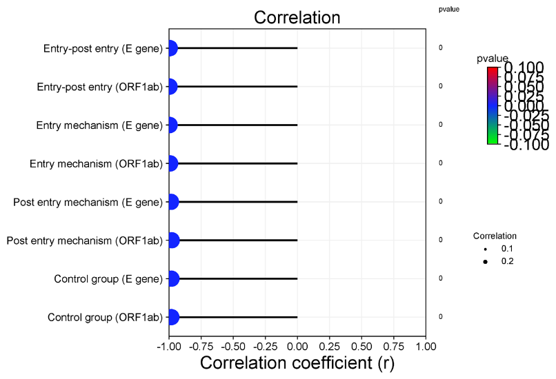 Time addition experiments with target genes based on correlation tests (fig. 7) show strong negative correlations between Ct value results and observation days, both on entry-post entry and entry and post-entry mechanisms. This suggests that the longer the observation day, the lower the Ct values, both in the treatment and control groups.