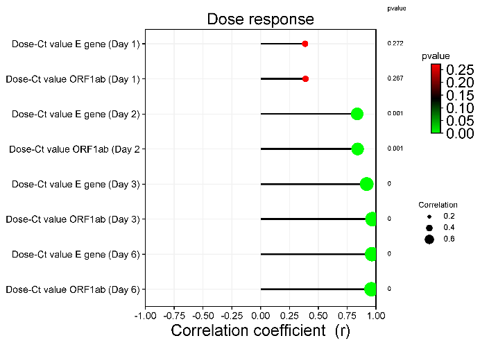 However, on day one observations, it showed a weak positive correlation, with a degree of significance of 0.272 (target gene E) and 0.267 (target gene ORF1ab).