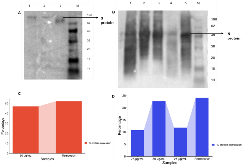 Fig. 9: Protein expression in S and N SARS-CoV-2. (A) The result of a western blot with the antibody Protein S; (1) 50 µg/ml; (2) remdesivir; (3) negative control; (B) The result of a western blot with the antibody Protein N; (1) 75 µg/ml; (2) 50 µg/ml; (3) 25 µg/ml; (4) Remdesivir; (5) negative control; (C) Protein S expression; (D) Protein N expression