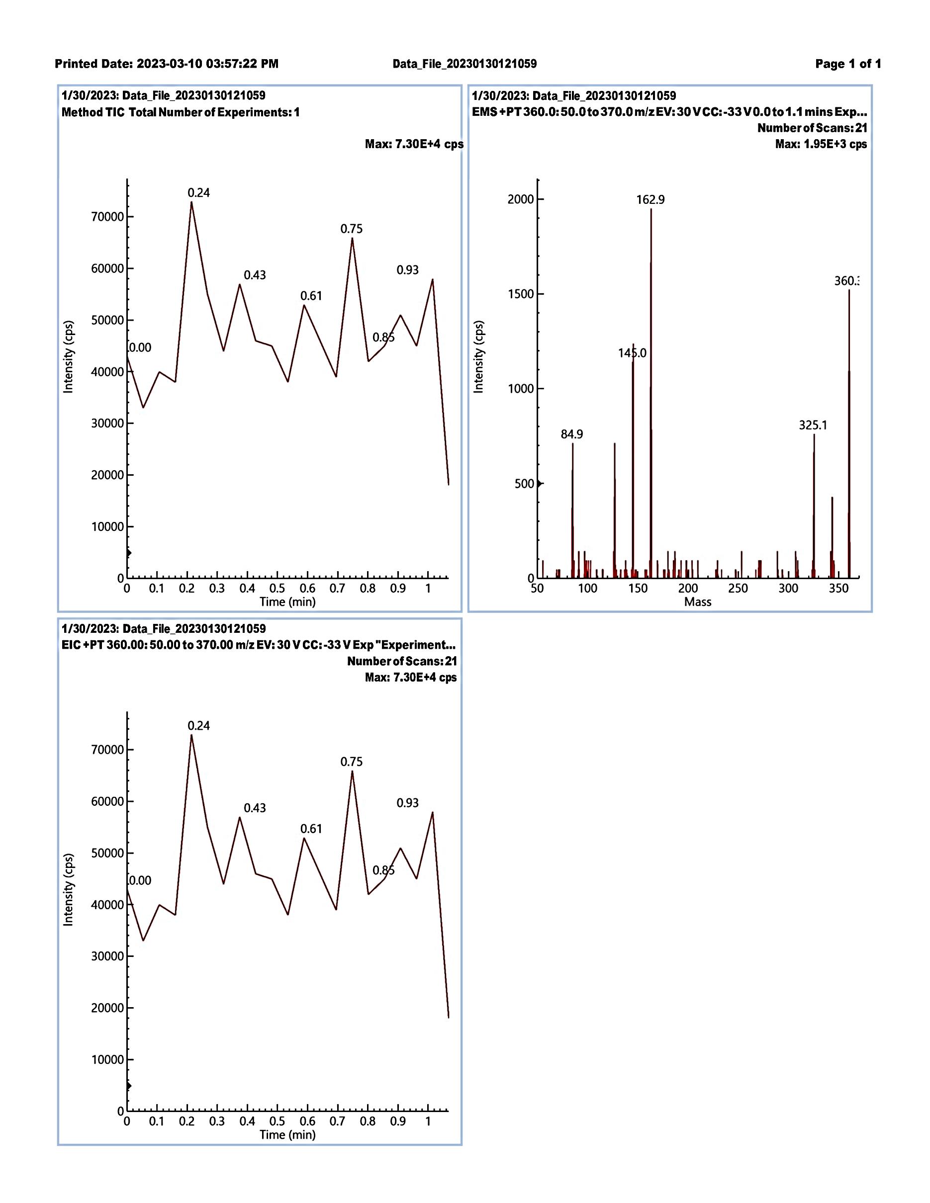 For the optimization of the ESI setting for papain standard, Quadrupole full scans were done in a positive ion detection mode. Throughout direct infusion experimentation, the mass spectra for papain revealed peaks at m/z 145.3, 163 and 325 as protonated molecular ions generated by direct photoionization. The MRM transitions m/z 360→145.3, 360→163, 522→325, 522→163.1 were employed for the measurement of Papain after extensive optimization of mass spectrometry settings. The mass spectra fragmentation pattern of precursor and product ion of the Papain enzyme is shown in fig. 1.