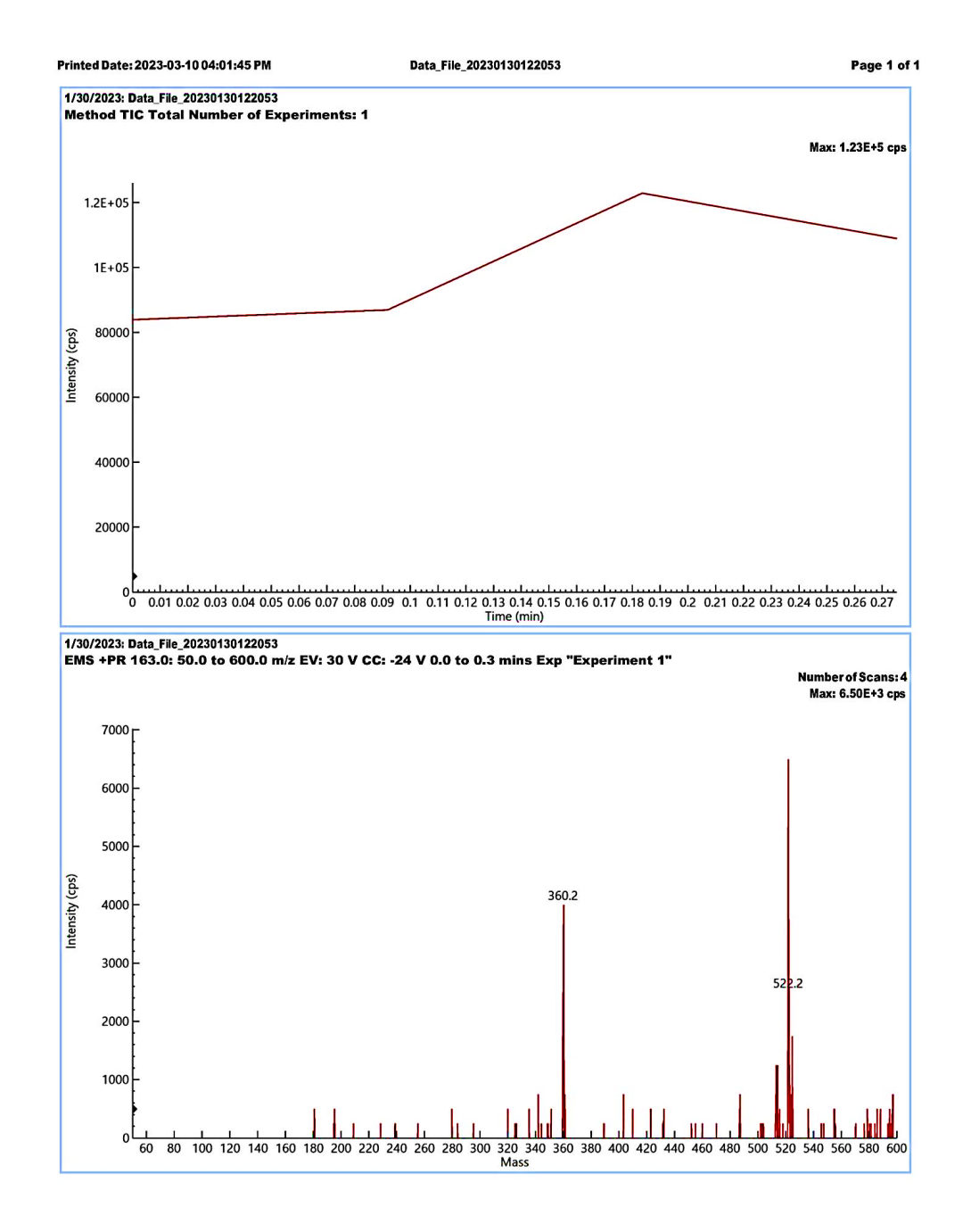 Standard Papain (1000 ng/ml) was used for mass analysis. The precursor ion at m/z 522.0 and production at m/z 360.3 have been obtained to monitor papain concentration.