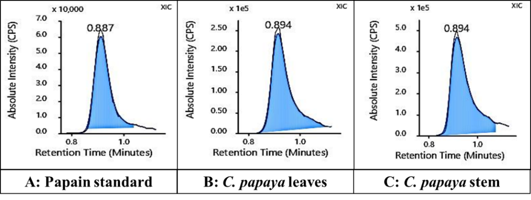 In conclusion, our original work has successfully established the LC-MS/MS method, enabling the simultaneous quantification of Papain standard and Papain within biological matrices, specifically papaya leaves and stems. This achievement marks a significant milestone in facilitating accurate determination and analysis of Papain, offering a robust approach for future studies in this domain. The Quasar C18 column was discovered to be the best option for attaining satisfactory chromatographic resolution in a gradient mode at 0.5 ml/min using 0.2% formic acid in water and 0.2% formic acid in acetonitrile (98:2%). Because the analytes have diverse physicochemical properties, method development was meticulously developed to allow the analysis of the analyte in a single test process. An accurate, easy, precise, highly sensitive, specific, and cost-effective approach for quantifying Papain and its matrix interferences was effectively developed and utilized. Under the parameters of this study, the method proposed in this paper is adequate for reliable assessments of papain content in extracted samples and reference papain. The technique performed brilliantly in terms of selectivity, linearity, accuracy, precision, recovery, detection limit, and quantitation limit. Furthermore, in terms of analytical run time, the novel procedure is quicker than previously published approaches. Because of its great sensitivity, the newly developed and validated approach will be valuable for clinical pharmacokinetic, biopharmaceutical, and bioequivalence research.