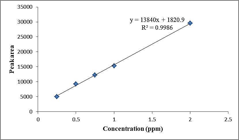 The linearity with five unique concentrations was developed for values ranging from 1 to 2000 ng/ml. R2 (correlation coefficient) was calculated to be 0.998. The calibration curve findings' standard deviations (SDs) were determined to be within the limits of the regression equation of y=13840x+1820.9 (fig. 3).