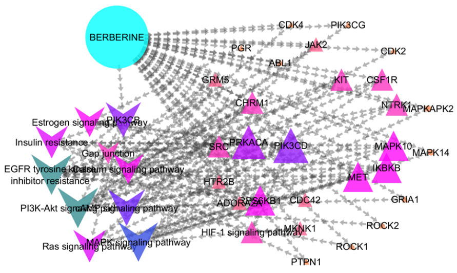 Fig. 1: Network representation between berberine, targets, and pathways interaction