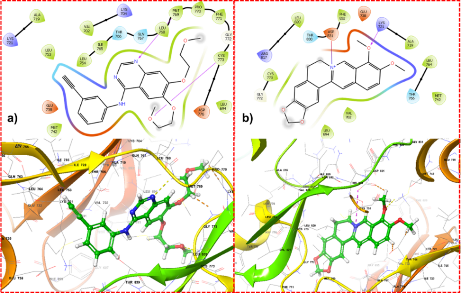 Fig. 2: Binding interaction of a) redocked cocrystal ligand and b) berberine with docked EGFR