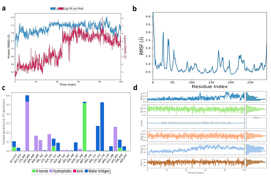 Fig. 3: a) RMSD, b) RMSF, c) protein-ligand contacts, and d) ligand properties estimated for simulated protein-ligand complex using 100 ns MD simulation