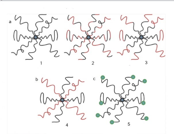 Fig. 3: Illustration of variuos star polymers classified by (a) compositon and sequence distribution of the arm polymer, (b) difference in arm species, and (c) functional placement [25]. 1-homopolymer, 2-random copolymer star, 3-block copolymer star, 4-compositional miktoarm star, 5-end-functionalized homopolymer star