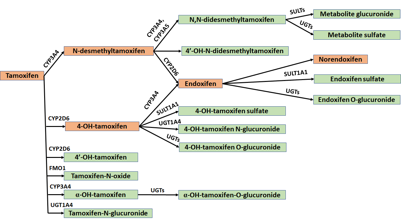 The phase II reactions of tamoxifen are the sulfation and glucuronidation reaction catalyzed by sulfotransferase (SULT) and uridine 5'-diphospho-glucuronosyltransferase (UGT). SULT and UGT play a vital role in tamoxifen and its metabolite elimination [37].