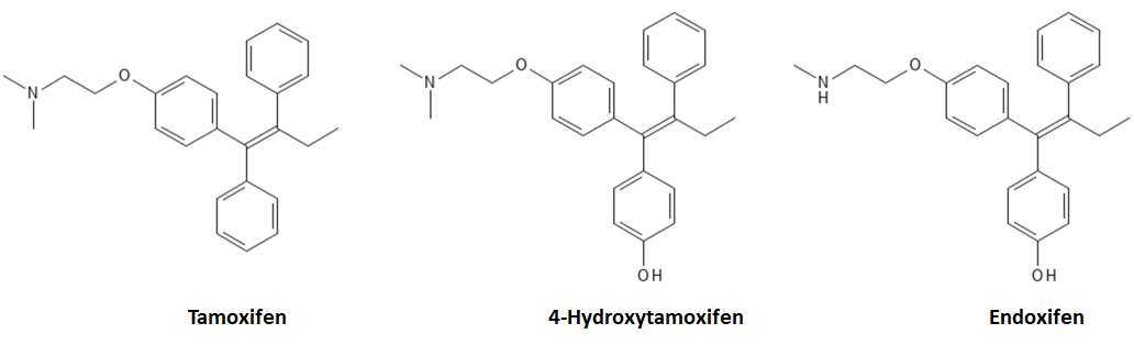 Fig. 2: The structure of tamoxifen and its active metabolites (4-hydroxytamoxifen and endoxifen)