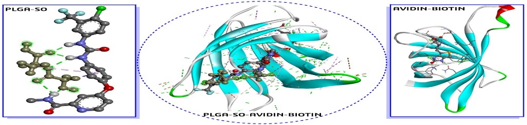 Fig. 1: Molecular docking analysis of PLGA-SO, AVIDIN-BIOTIN, and PLGA-SO-AVIDIN-BIOTIN in a single complex. The interface was visualised using BIOVIA-DSV software and an image assembled by Chem Draw 21.0 software