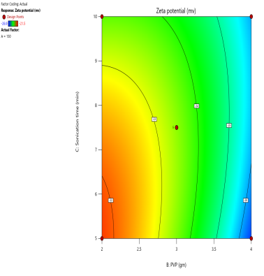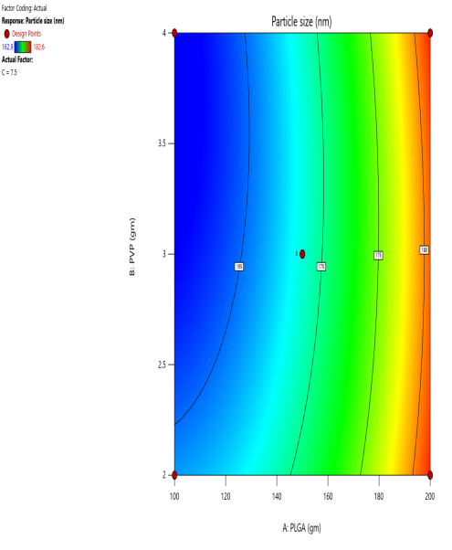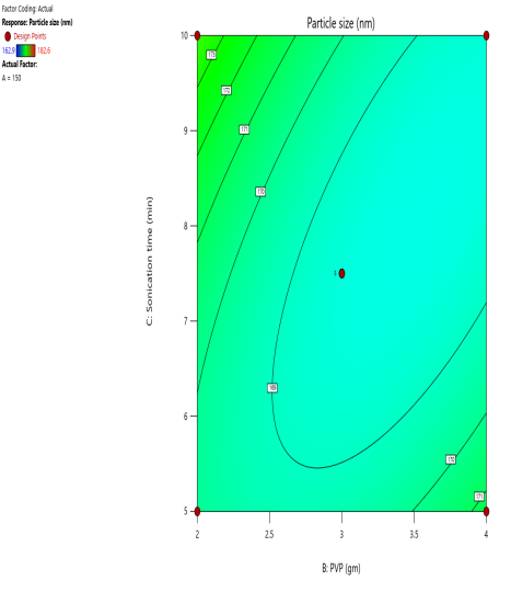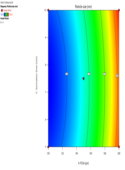 Fig. 2: (a) 2D Counter plot depicting the effect of PLGA, PVA and Sonication time on the particle size