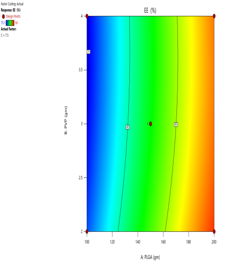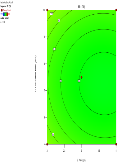 Fig. 3: (a) 2D Counter plot depicting the effect of PLGA, PVA and sonication time on the EE%