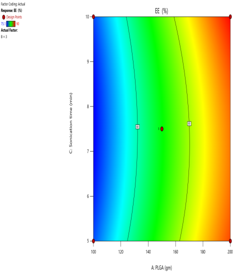 Fig. 4: (a) 2D Counter plot depicting the effect of PLGA, PVA and sonication time on the EE%