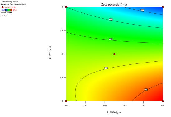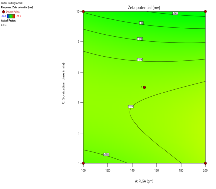 The zeta potential analysis for the prepared polymeric nanoparticle formulations was also done using Malvern zeta sizer. The higher Zeta potential values of a formulation indicate increased stability of the polymeric nanoparticles. Regression Statistics was implemented and fitting to Quadratic model of zeta potential. Reduced polynomial equation for zeta potential obtained was: