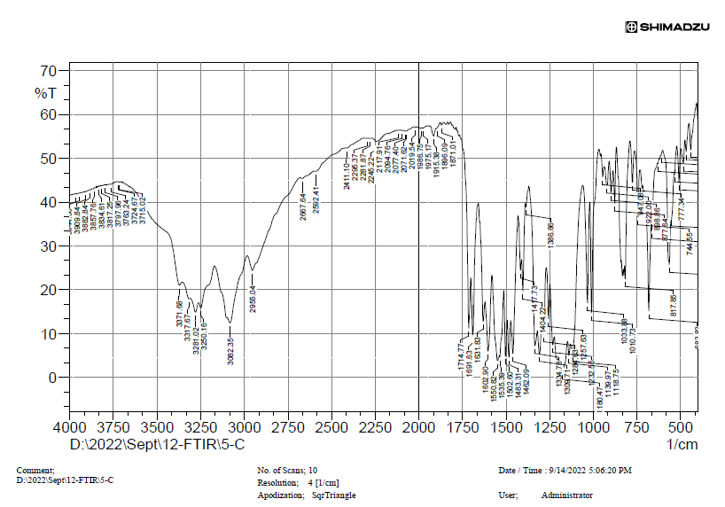 The Fourier Transform Infrared (FTIR) analysis was performed to know the chemical interaction between the drug and polymer inside the prepared nanoparticles. Fourier Transform Infrared spectroscopy was performed using a Shimadzu FTIR in scanning region from 4000 to 400 cm-1 region [29].