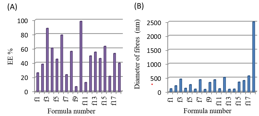 Fig. 1: Results of nanofibres investigations. (A) The EE% of voriconazole in the polymers; and (B) The nanofiber's diameter in nm. Data is given in mean±SD, n=3