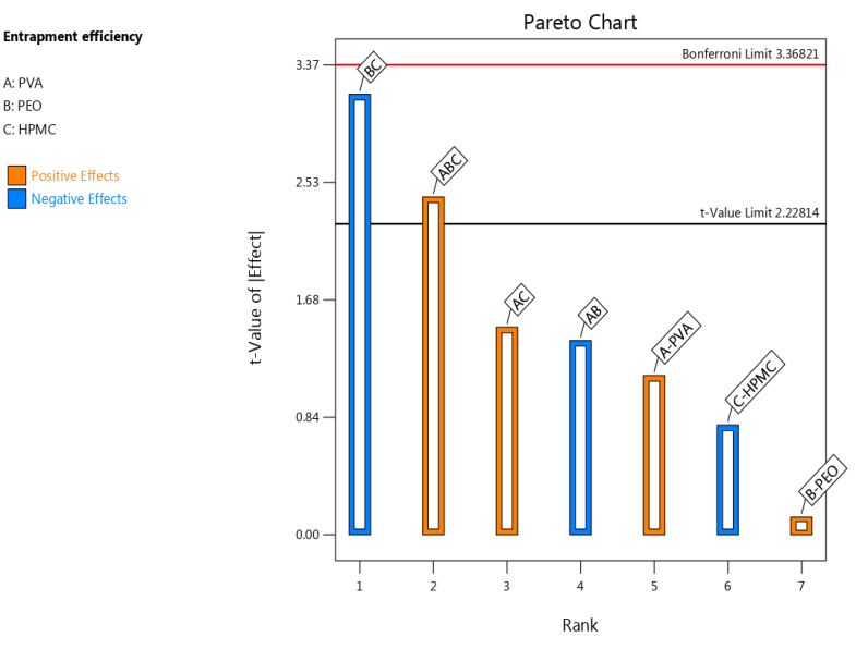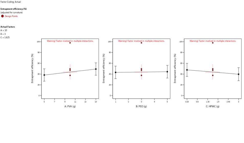 Where EE% was the entrapment efficiency, A was PVA, B was PEO, and C was HPMC.