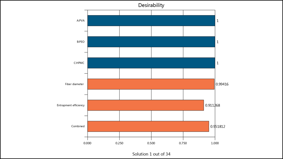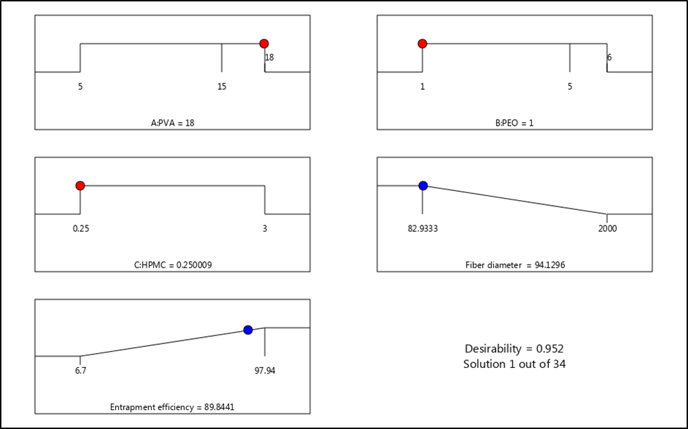 Depending on statistical analysis achieved by Design-Expert® software, the optimised formula (or formulas) would be obtained depending on the analysis of data and the highest desirability for each factor and response. Therefore, the software introduced many solutions (optimum formulas) regarding the highest value of EE% and lowest value of nanofiber diameter. The chosen formula must have the highest desirability based on statistical analysis. Nanofibers obtained from the optimised formula will be investigated further and compared with the suggested theoretical solution [41].