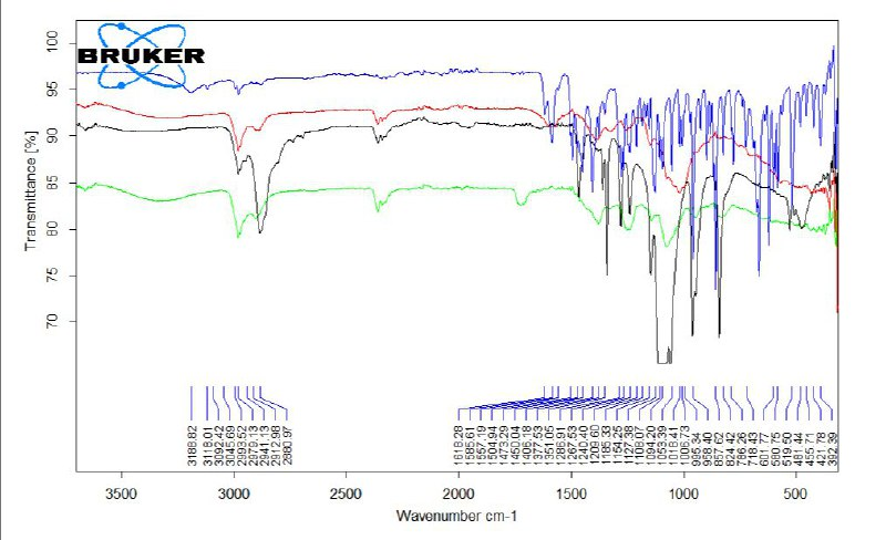 Fig. 7: FTIR spectrum of voriconazole pure drug and three polymers. Blue: voriconazole, red: PVA, black, PEO and green: HPMC