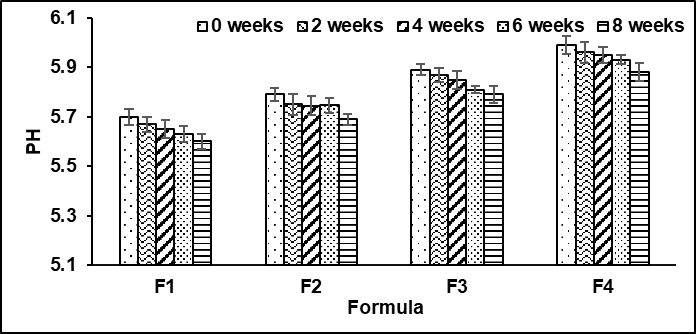 Fig. 3: The pH of the films after saving 2 mo in 40±2 ℃. Data in mean±SD (n=6)