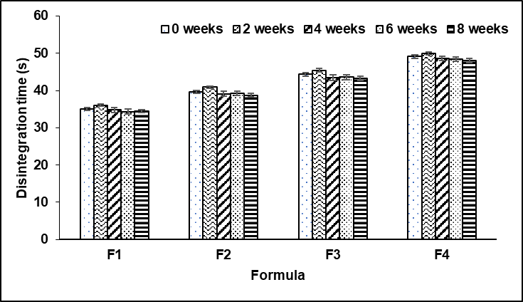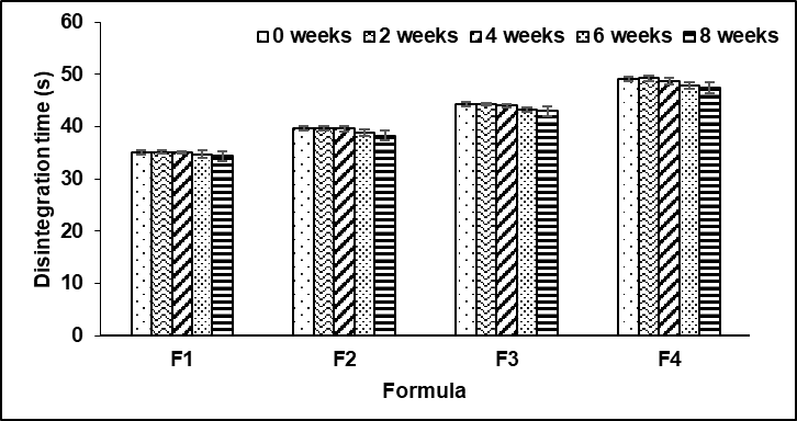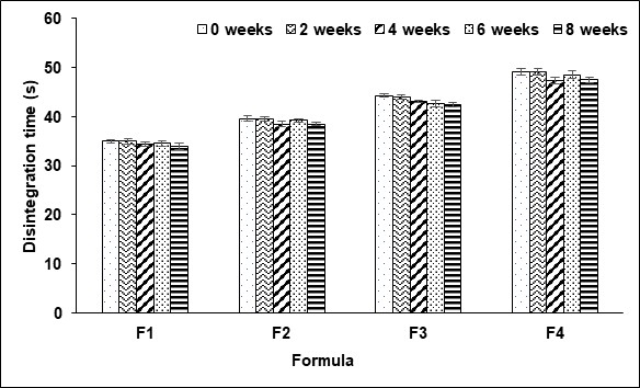 Fig. 6: Disintegration time stability evaluation in 40±2 ℃. Data in mean±SD, (n=6)