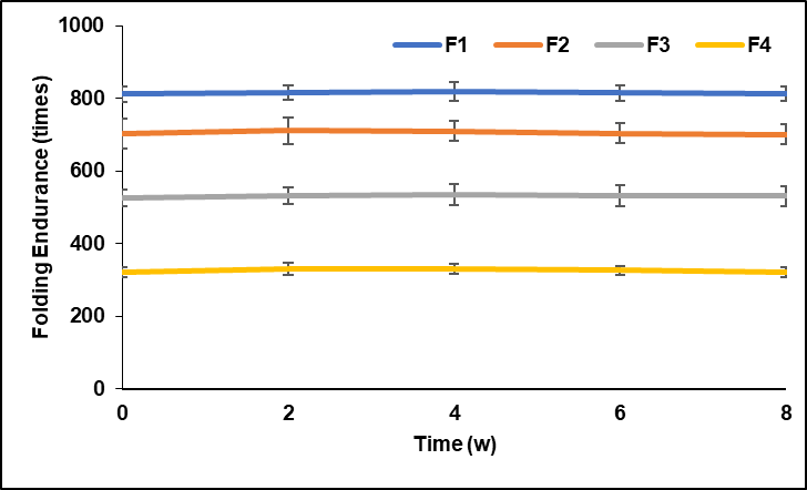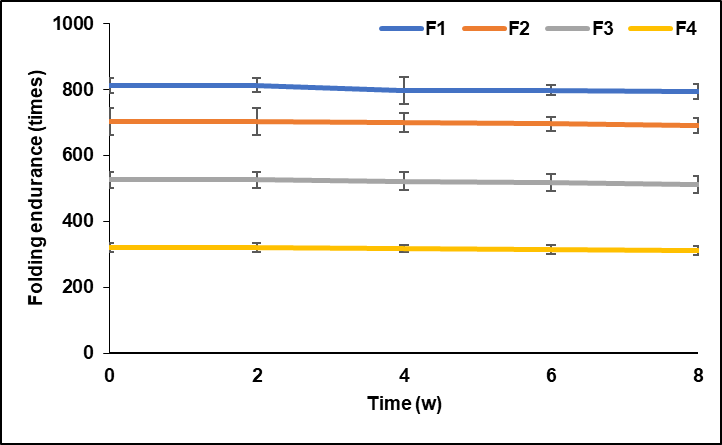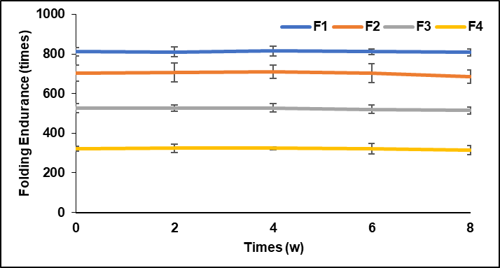 Fig. 7: Folding endurance stability evaluation at 4±2 ℃. Data in mean±SD, (n=6)
