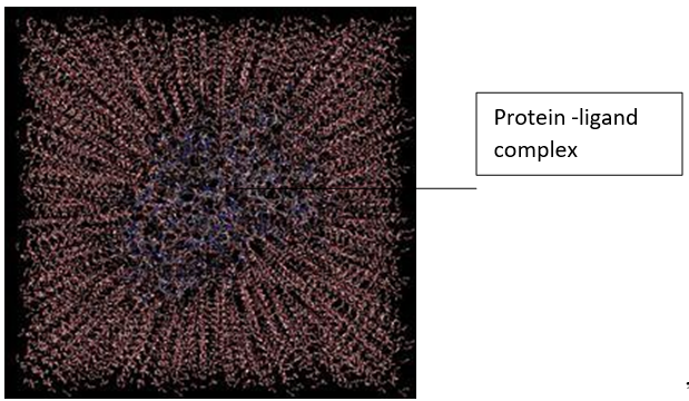 Time-step methods were used in the reference system propagator algorithm for bonded Electrostatic forces, which can be non-bonded, short-range, or long-range. Every 100 PS, data was collected [18] and trajectories were analyzed. We have performed MD simulation using (Schrödinger suite 2021-4), to investigate top-ranked compounds' nuclear binding behaviour, and understand molecular interfaces [19]. To solve the complex Compound 1/1E2D, the TIP4P water model with orthorhombic periodic borders and a buffer zone of 10 between Protein atoms and box edges was employed [20]. To neutralize the generated system 0.15 molar, NaCl counter ions were provided. The energy was minimized using the OPLS4 force field adjustments. Long-range electrostatic interactions were calculated with a tolerance of 1e-09 utilizing the Ewald Smooth Particle Mesh method [21]. The short-range Vander Waals and Coulomb interactions were estimated at a cut-off radius of 9.0. One hundred ns of MD simulations at two fs per time step were done at 300 Kelvin and 1 bar of pressure in an isothermal-isobaric ensemble [Simulation of a system with constant number (N) and constant temperature (T), but variable pressure (P)]. At 100 and 200 PS, The Nose-Hoover thermostat chain thermostat and Martyna-Tobias-Klein barostat techniques are integrated [22]. Multiple time-step methods were used in the reference system propagator algorithm for bonded Electrostatic forces, which can be non-bonded, short-range, or long-range. Every 100 PS, data was collected, and trajectories were analyzed [23] to solve the complex compound 1/1E2D as shown in fig. 2.