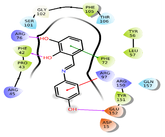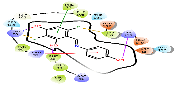 The ligand trichloro-6-((4-hydroxyphenyl) imino) methyl) phenol compound 1/1E2D docked pose was ran for 100 ns in molecular dynamic simulations. By doing this study, we observed results in RMSD; root mean square fluctuations (RMSF) protein-ligand interactions fractions, protein-ligand contacts timeline, and protein-ligand contacts with a 2D diagram. Cα atom (lig) fit on prot was observed and stabilized simulations docked pose for ligand compound 1/1E2D in RMSD was evaluated. The value of the Cα atom was 0.8 to 3.1 Å and the (lig) fit prot was 0.5 to 3.2 Å. The Cα atom for the ligand maintained stability for 65 ns out of 100 ns, and for the remaining 35 ns Cα atom maintained moderate stability out of 100 ns. The ligand was stable from 0.9 to 1.3 Å, which is 15 ns to 50 ns and the next phase of stability starts from 1.2 to 3.1 Å i.e., 70 ns to 100 ns ligand was stable in the protein. The moderate stability for the ligand starts from 0.8 to 1.2 Å i.e., 0 to 15 ns ligand showed moderate fluctuations. The next phase of moderate stability starts from 1.1 to 1.6 Å i.e.,50 to 70 ns ligand showed moderate fluctuations.