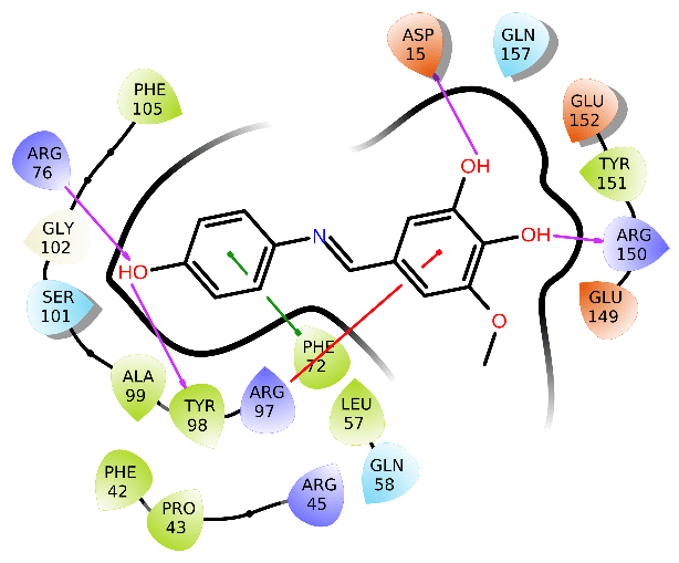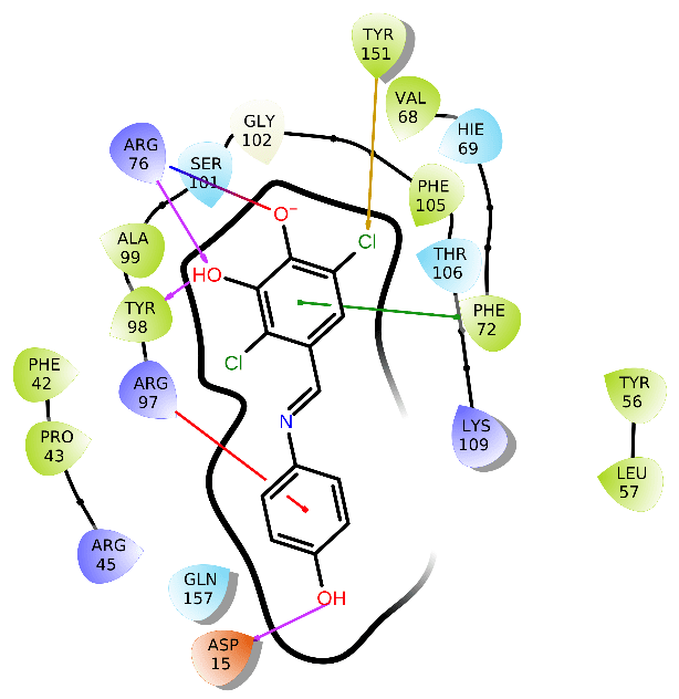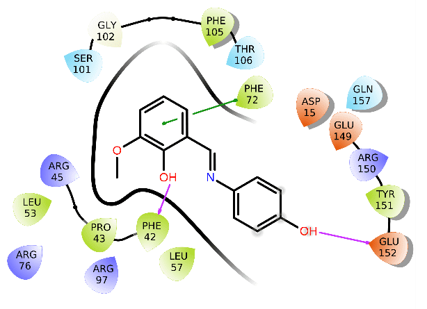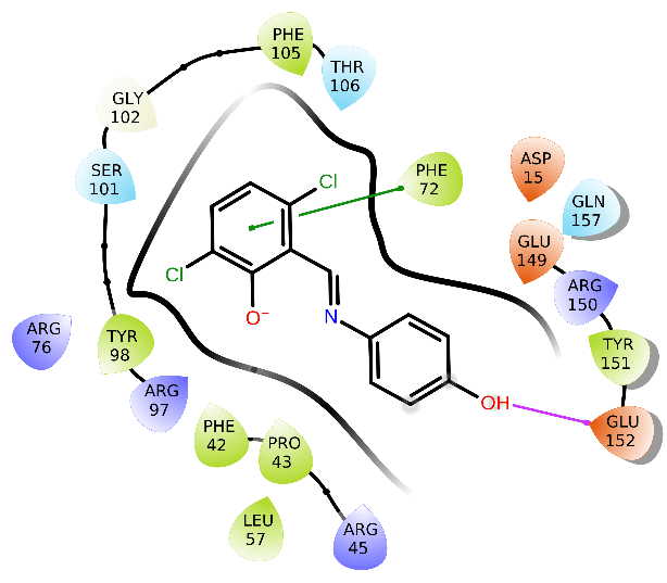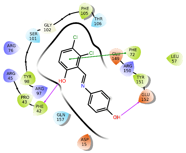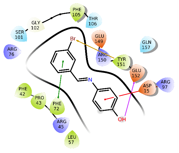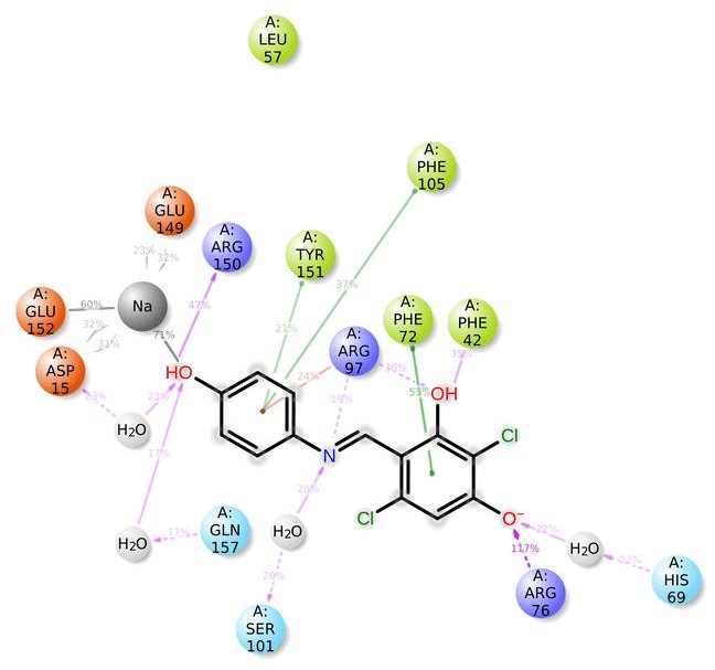 Phe72 maintained continuous contact with the aromatic ring with pi-pi stacking; the bond was stable at 53%. Arg76 maintained constant contact with the oxygen group with a hydrogen bond, the bond was steady at 117%. Arg150 maintained continuous contact with the hydroxy group with a hydrogen bond, the bond was stable at 47%. Phe105 maintained constant contact with benzene by forming pi-pi stacking; the bond was steady at 47%. Phe42 maintained continuous contact with the hydroxy group by forming a hydrogen bond, the bond was stable at 35%. His69 maintained constant contact with the oxygen group by forming a hydrogen bond, the bond was stable at 22%. Arg97 maintained continuous contact with the nitrogen group on the (benzylidene moiety) by forming a hydrogen bond, the bond was stable at 19%. Ser101 maintained constant contact with the nitrogen group on the (benzylidene moiety) by forming a hydrogen bond, the bond was stable at 20%. Arg97 maintained continuous contact with the benzene with an ionic bond, the bond was stable at 24%. Phe105 maintained constant contact with the aromatic ring by forming pi-pi stacking, the bond was steady at 37%. Tyr151 maintained continuous contact with the aromatic ring by forming pi-pi stacking, the bond was stable at 21%. Glu152 maintained constant contact with the hydroxy group by forming a water bridge, and the bond was steady at 60%. Asp15 maintained continuous contact with the hydroxy group with the water bridge, the bond was stable at 23%. As per the above results, the ligand compound 1 showed promising activity in developing the new anticancer agents.