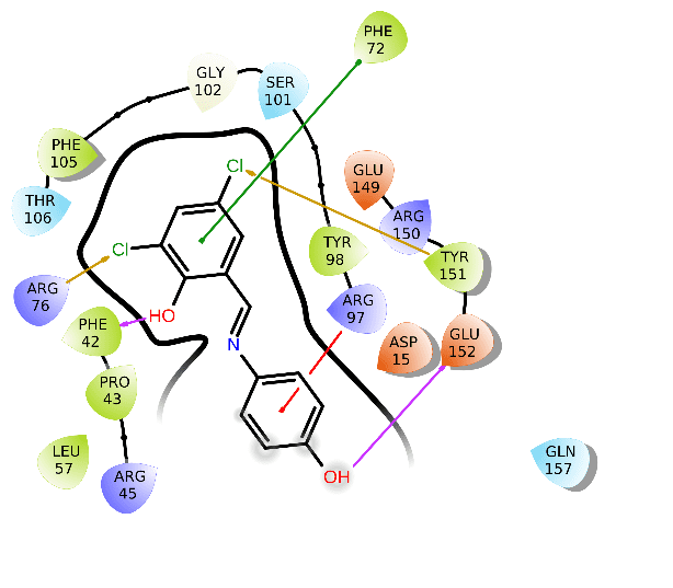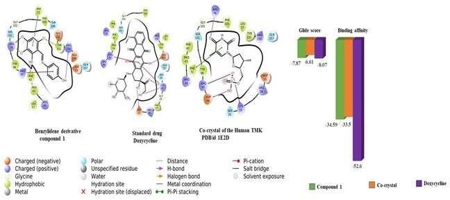 Stage III: In this phase, the tumour also affects regional nodes [4]. Nowadays, TMK is an attractive target because, in eukaryotic cells, it plays an important role in DNA formation. TMK is a catalyst between Deoxythymidine Monophosphate(dTMP) and Deoxythymidine Diphosphate (dTDP). In the presence of nucleoside kinase, this dTDP forms Deoxythymidine Triphosphate (dTTP) [5]. dTTP plays a pivotal role in DNA formation. When TMK is blocked, it hinders the formation of dTDP, resulting in the blockade of dTTP. As a result, DNA production is inhibited. This function has made TMK a desirable target for developing antibiotics and anticancer drugs. TMK enzyme is present in human (eukaryotic) and bacterial (prokaryotic) cells. The eukaryotic consensus sequence Gxxx1xGKx of the p-loop contains arginine residues in its X1 position, which interacts with Adenosine Triphosphate (ATP) [6]. The prokaryotic consensus sequence Gxxx1xGKx of the p-loop possesses glycine residues in its X1 position. Arginine residues present in the LID region interact with ATP [7] identifying the low (19%) sequence homology between the human and S. aureus TMK X-ray structures adds credence to TMK’s potential as a target for developing anti-cancer drugs and antibiotics. Arg76, Arg97, and Arg150 are present in the TMP binding cavity. These residues and Phe72 actively participated in transferring ATP from dTMP which results in the formation of dTDP. The possibility would be to design inhibitors containing hydrogen-bonding groups targeting Arg76, Arg97, and Arg150 at the base of the TMP-binding cavity of TMK. In the present work, we have targeted the charged residues Arg76, Arg97, and Arg150 at the base of the TMP-binding cavity and Phe72 of TMK [8]. We have designed ten ligands from benzylidene derivatives. The designed ligands are Trichloro-6-(((4-hydroxyphenyl)imino)methyl)phenol (Compound 1), 3-(((4-hydroxyphenyl)imino)methyl)-6-methoxybenzene-1,2-diol (Compound 2), 3,6-dichloro-4-(((4-hydroxyphenyl)imino)methyl)benzene-1,2-diol (Compound 3), 4-((3-fluorobenzylidene)amino)phenol (Compound 4), 3-(((4-hydroxyphenyl)imino)methyl)benzene-1,2-diol (Compound 5), 2,4-dichloro-6-(((4-hydroxyphenyl)imino)methyl)phenol (Compound 6), 2-(((4-hydroxyphenyl)imino)methyl)-6-methoxyphenol (Compound 7), 4-((3-nitrobenzylidene)amino)phenol (Compound 8), 3,6-dichloro-2-(((4-hydroxyphenyl)imino)methyl)phenol (Compound 9), 3,4-dichloro-2-(((4-hydroxyphenyl)imino)methyl)phenol (Compound 10). A Previous study reported that N-(3,4,5-trimethoxybenzylidene)-2-(5-(4-nitrophenoxy)methyl-1,3,4-oxadiazol-2-yl) thioacetohydrazide ligand inhibits neoplastic cell growth in hepatocellular carcinoma by performing in vitro studies against HepG-2 cell line. This ligand has IC50 value of 90.2±8.1 μg/ml, which shows moderate cytotoxicity against HepG-2 cells which is near to the reference anti-cancer drug 5-fluorouracil (5FU) [9]. This ligand also contains benzylidene moiety, but this study was not performed on colon cancer [10]. We are targeting particularly colon cancer with benzylidene derivates. We have performed in silico studies; in which we obtained glide score (−7.87 kcal/mol) in XP docking, and MM-GBSA studies we obtained binding affinity (ΔBind-34.59 kcal/mol) and in MD studies this ligand showed interactions with active target Arg76, Phe72. Similarly, we performed in silico studies for the standard drug doxycycline for which we obtained glide score (-8.07 kcal/mol) and binding affinity (ΔBind-52.60 kcal/mol). When we compared the in silico results of doxycycline with Compound 1, benzylidene derivatives showed good glide score and binding affinity near to reference standard drug doxycycline whereas PDB id 1E2D co-crystal ligand showed less glide score (-6.61 kcal/mol) and binding affinity (ΔBind-33.50 kcal/mol) compared to benzylidene derivatives. This ligand may give promising results in in vitro activity against colon cancer.