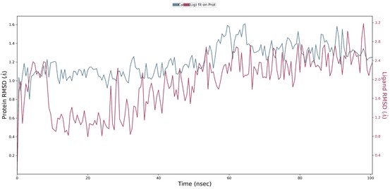 (lig) fit prot for the ligand maintained stability for 72 ns out of 100 ns, and for the remaining 28 ns (lig) fit prot maintained moderate stability out of 100 ns. From 0.4 to 0.8 Å i.e.,18 ns to 55 ns ligand was stable and the next phase of stability starts from 1.1 to 3.2 Å i.e., 65 ns to 100 ns ligand was steady in the protein. The moderate stability for the ligand starts from 0.5 to 1.6 Å i.e., 0 to 18 ns ligand showed moderate fluctuations. The next phase of moderate stability starts from 0.8 to 1.4 Å i.e., 55 to 65 ns ligand showed moderate fluctuations. These results are depicted in fig. 5.