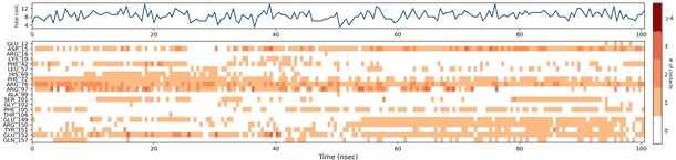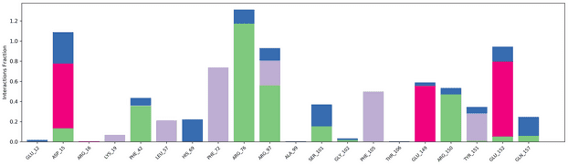 In fig. 7, the ligand maintained continuous interactions with amino acids with different bonds like water bridge, hydrogen bonds, and ionic and hydrophobic interactions, respectively, and this ligand also formed multiple interactions with amino acids. The ligand formed contacts with amino acids. Ligand formed a water bridge bond with Glu12, His69, and Ala99 residues and maintained it at 0.2% out of 1.3%. This ligand formed hydrophobic interactions with Lys19, Leu57, Phe72, Phe105, and maintained its interactions at 0.8% out of 1.3%., and hydrogen bond interactions were formed with Tyr106, Arg76, amino acids, and maintained its interactions at 1.1% out of 1.3%, and ionic interaction with Arg16 residue and this ligand formed multiple interactions with amino acids Asp15, Phe42, Arg76, Arg97, Ser101, Gly102, Glu149, Arg150, Tyr151, Glu152, Gln157, maintaining the multiple interactions percentage at 1.2% out of 1.3%.