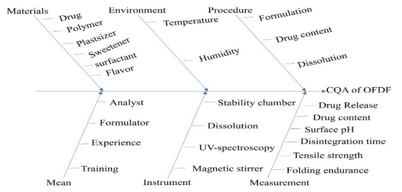 To determined via risk assessment studies which critical material attributes (CMAs) and CPPs had the greatest impact on OFDF's CQAs. Fig. 1 presents an Ishikawa fishbone diagram that illustrates the possible high-risk elements that might impact the quality of the formulation. The specified features are important characteristics and/or factors for producing OFDF while employing TMS.