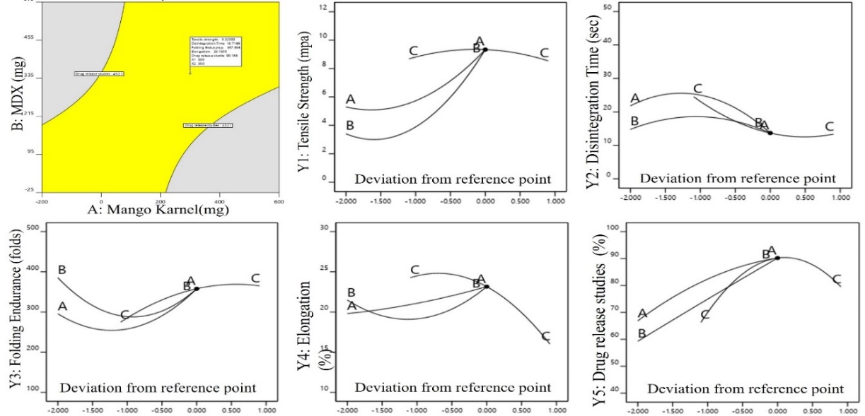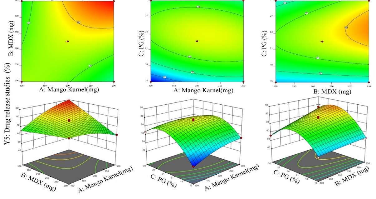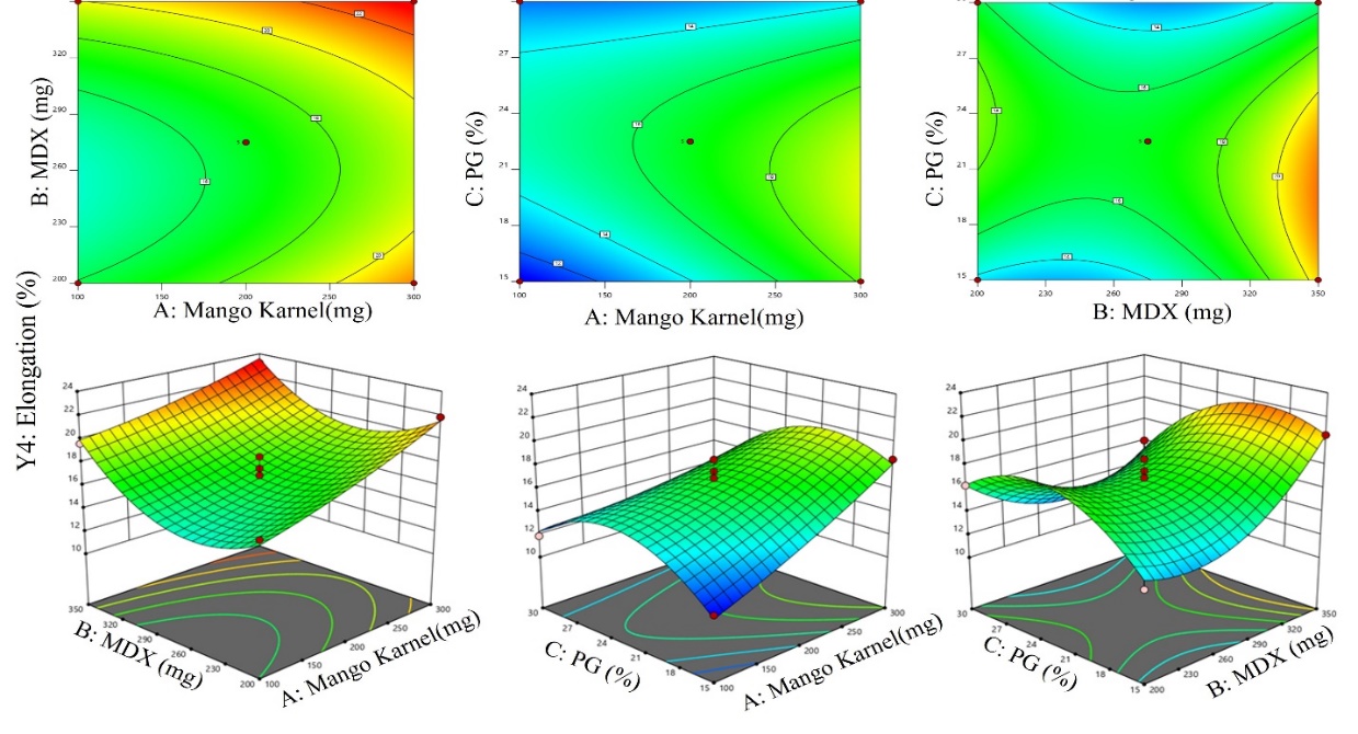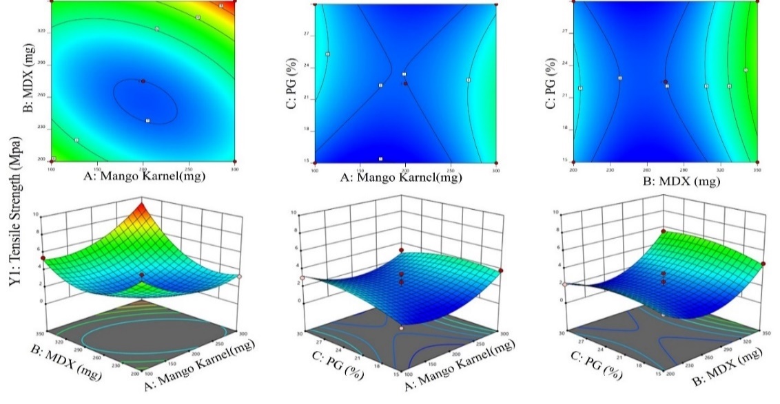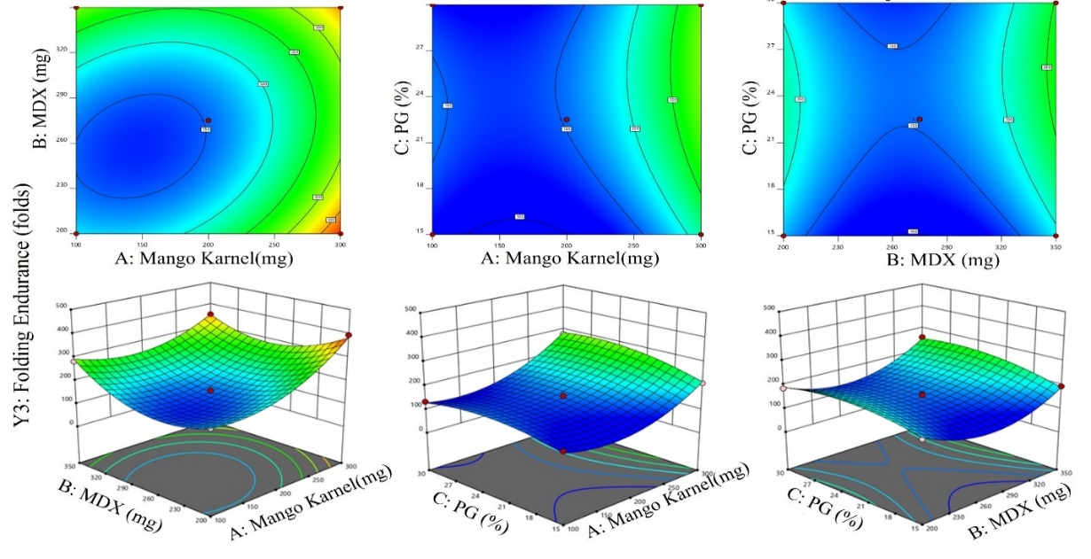 The purpose of a DoE is to measure the impact of various process characteristics on the efficacy of a formulation. This independent factors affected the dependent variables using a Box-Behnken design (BBD). The experiment was planned using Design-Expert 12.0.3.0 (State-Ease Inc., Version 12.0.3.0, Minneapolis, USA). Responses were examined in terms of tensile strength (mpa), folding endurance (mpa), disintegration time (s), elongation (%), drug release studies (Y4), and PG (%). Three independent variables (factors) were investigated: PG (%) (X3), maltodextrin (mg) (X2), and mango kernel (mg) (X1). To formulte of OFDF, preparatory experiments were used to choose the components (X1, X2, and X3) and determine their values. The many components used in the formulation of OFDF are shown in table 1 with the results of DoE experiments with well-stated dependent variables. Each batch of formulation underwent an independent series of experiments [27].