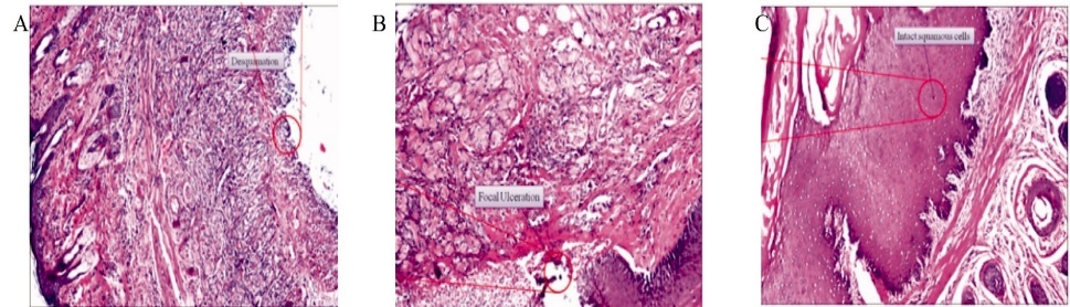 Histological analysis was undertaken to determine the severity of the pathological alterations in tissue shape and organization brought on using bucco adhesive film. Fast-dissolving film should be harmless to the oral mucosa, with no side effects like those seen with controlled oral mucosa (redness, no irritation, no ulcers). Ex-vivo muco irritation was studied using eosin stain in this research, with the improved F4 formulation. Eosin is a luminous acidic molecule that stains dark red or pink when it attaches to positively charged components including proteins, collagen, and muscle fibers. Red blood cells are also strongly stained by eosin. This dye is the gold standard for histological research. The oral mucosa from a live sheep was used to conduct ex-vivo muco irritation. Fig. 8 displays the outcomes in comparison to untreated oral mucosa [72].