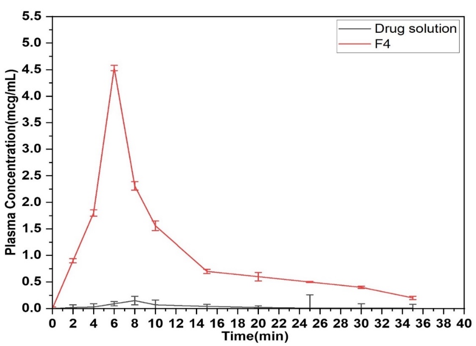 A validated HPLC method, developed in-house, was used to accurately measure telmisartan levels in the blood of rats. Supplementary table 7 summarizes the pharmacokinetic data, and fig. displays a plot of plasma concentrations vs time. The lowest mean Telmisartan plasma concentrations were seen after dosing with the aqueous solutions [73]. When compared to the AUC determined for the aqueous Telmisartan solution, the AUC was 30 times higher when Telmisartan was supplied as the oral rapid dissolving films. In comparison to the Cmax achieved with the same dosage of Telmisartan taken as an aqueous solution, the Cmax obtained with the optimized oral rapid dissolving films was 29.02-fold greater at 4.586 g/ml. Oral rapid dissolving films have the potential to have a larger Cmax without changing the Tmax (fig. 9) since the Tmax (35 min) after dosing was the same as that achieved inside aqueous solutions (35 min). These findings demonstrate that the oral fast-dissolving film formulation of Telmisartan significantly improves absorption compared to the aqueous suspensions [74].