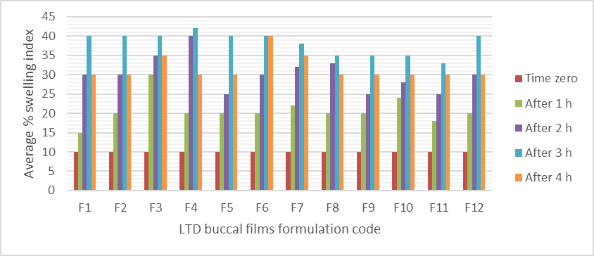 The test was conducted by keeping three films from each formulation after weight on stainless steel sieving mesh pre-weighed. The mesh containing the film was submerged in a beaker containing 100 ml of phosphate buffer pH 6.8 and maintained in an oven at 37±2 °C. At regular one-hour time intervals, the mesh was removed, dried with tissue, and reweighed. An increase in weight was determined every hour until a constant weight was obtained [36].