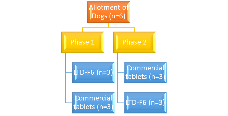 The in vivo pharmacokinetic study was accompanied in agreement with the ethical guidelines for laboratory animals use and was permitted by the Institutional Animal Ethics Committee, Qassim University (number 22/13/02). All procedures and care of the “beagle dogs” were in accordance with institutional guidelines in research. Six male beagle dogs weighing 12.5–14 kg were used and divided into two groups randomly (fig. 4), and the study was carried out in a crossover design in two phases with a washout period of one week to eliminate the effect of the previous drug treatment before the administration of the next drug dose. No food was allowed during the experiment up to 12 h. Water was available ad libitum thru the study period. During the first phase, films were located in the buccal membrane with the help of a clip for the first group, while the second group received orally one tablet of marketed product “10 mg” and vice versa in the second phase.
