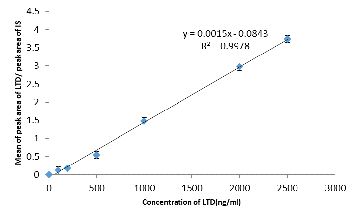 Calibration curves were prepared by making serial dilution of the working stock and assaying standard plasma samples at six concentrations of LTD ranging 200-2000 ng/ml. The validation of LLOQ was conducted in at least six different batches of blank plasma. It was validated using an LLOQ sample for which an acceptable accuracy (RE) within 20% and a precision (R. SD) below 20% were obtained [45].