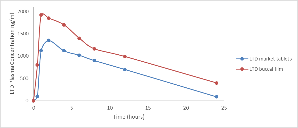 Pharmacokinetic study of the optimized mucoadhesive buccal film of LTD compared with marketed LTD tablets were investigated in beagle dogs on two phases (fig. 4). The mean concentration-time profiles for LTD batch and commercial product are shown in fig. 7 and table 4. Results revealed that, after buccal adhesion of buccal batch F6 and oral use of market product to beagle dogs, drug appeared in plasma after a 0.53±0.12 h, 0.51±0.1 h, and 0.70±0.24h, respectively. Mean peak drug concentration of F6 Cmax (2.009±0.15 µg/ml) was higher than that of market product (1.376±0.42µg/ml). The mean time to reach the peak concentration (tmax) was non statistically significant difference (P>0.05). Moreover, there was a significant difference (P>0.05) in the terminal elimination rate constant among the two product. The AUC0-24 value was 54.09±12.46, and 64.72±11.92 (µg. h. ml-1) for market product and F6, respectively, suggest that buccal batch of LTD showed higher rate and extent of drug absorption than market oral tablets. The relative bioavailability of F6 was 113.45% higher than market tablets. The higher bioavailability of mucoadhesive batch may be interpreted on the base of (i) The rapid diffusion of outermost drug particles that inter to blood flow directly without metabolism helps to appear of the drug in the circulation faster than oral tablets (ii) In addition the polymer content in batch system; forming a swollen gel with longer diffusion path that could substantially reduce the release rate of LTD from the batch.