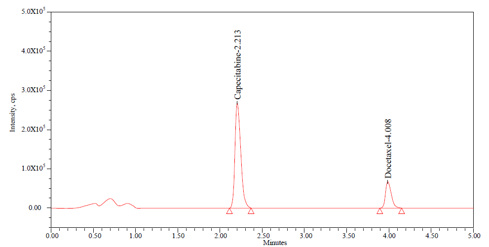 Results: Analysis was carried out within 5 min over a good linear concentration range from 37.5ng/ml to 300ng/ml (r2= 0.9999±0.008) for Capecitabine and 10ng/ml to 80ng/ml (r2=0.9993±0.005) for Docetaxel. Accuracy, precision, recovery, matrix effect and stability results were found to be within suitable limits.
