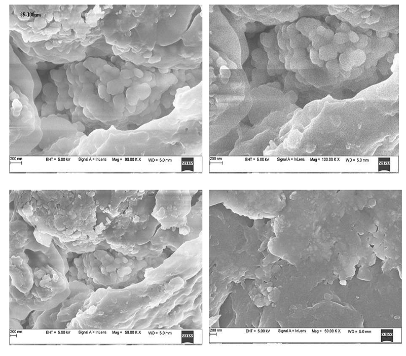 SEM images revealed the existence of silver nanoparticles with structures and dimensions ranging from 35 to 100 nm (fig. 1). The occurrence of metallic silver region at 5Kev in the aqueous leaf extract of Premna integrifolia confirms the formation of silver nanoparticles. According to investigations on elemental composition, several elements, such as carbon and oxygen, were present in percentages of 30.71% and 61.41%, respectively, and silver in 7.88% (fig. 2).