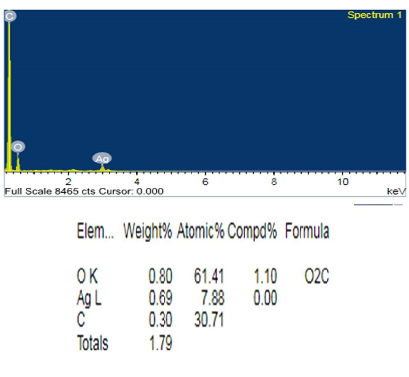 The elemental composition of the dried reduced Silver Nanoparticles on a carbon-coated copper grid was determined using Energy Dispersive X-ray method [26].