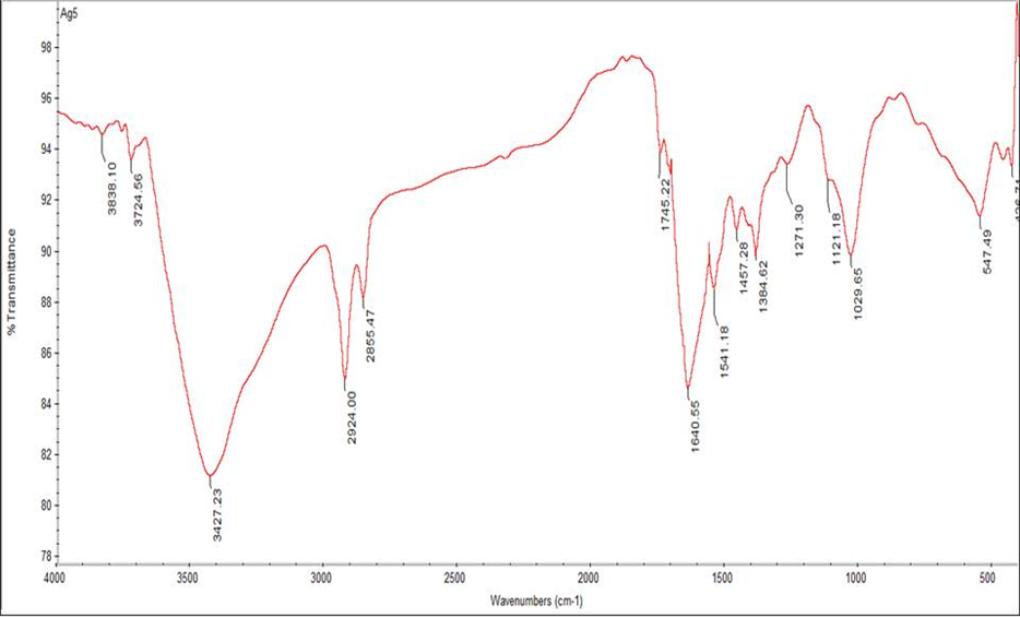 The functional groups that are responsible for biological reduction, which is attached to the silver surface and involved in the synthesis of Silver Nanoparticles, were found using FTIR spectroscopy [22]. Silver Nanoparticles were extracted after a 72 h of incubation period by centrifuging of the reaction mixtures for about three to four times at 10,000 rpm for 15 min. The supernatant was replaced with Deionized water, and the particle was then pulverized and stored. Dried Silver Nanoparticles were analysed using FTIR spectroscopy, using the potassium bromide pelletization method with a ratio of 1:100 [23].