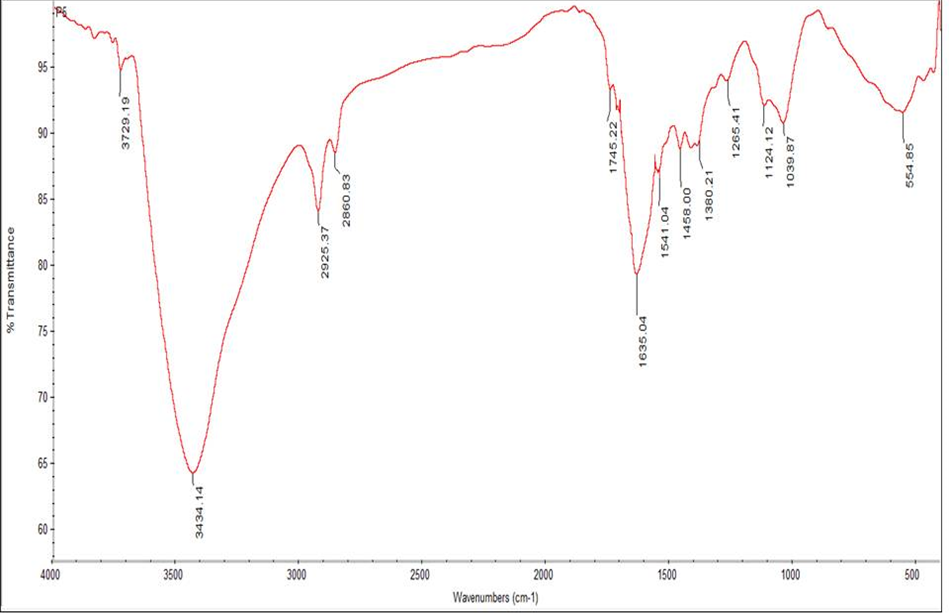 FTIR spectra of aqueous plant extract and the synthesized Silver Nanoparticles displayed a range of functional groups including alkyl halides, alkynes, aromatics amines, aliphatic amines, esters, ethers, alcohols, carboxylic acids and nitro compounds. These functional groups were identified on the presence of correlating peaks at 554.85 cm-1, 1039.87 cm-1, 1265.41 cm-1, 1458.00 cm-1, 1541.04 cm-1, 1635.00 cm-1, 1745.22 cm-1, 2860.83 cm-1 and 3434.14 cm-1 which acts as capping agents and formation of Silver Nanoparticles (fig. 3 and 4).
